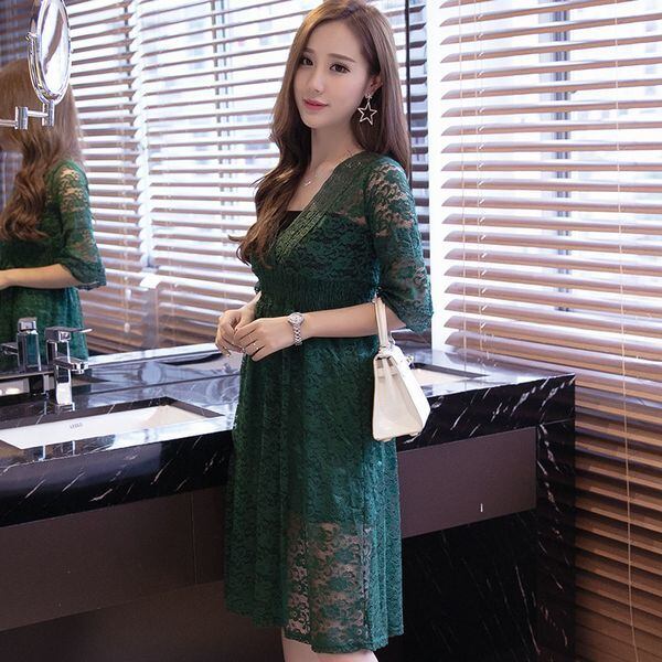 Vネック レース チュニック 切り替え 七分袖 ワンピース 大きいサイズ