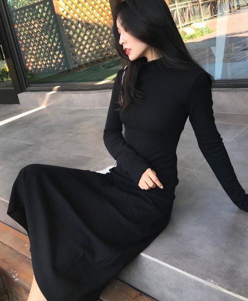 ハイネック フレアスカート ワンピース ブラック モノトーン ニットワンピ