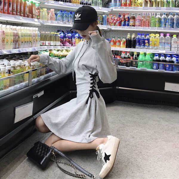 パーカー フード付 ワンピース レースアップ フレアスカート カジュアルミニ ワンピ
