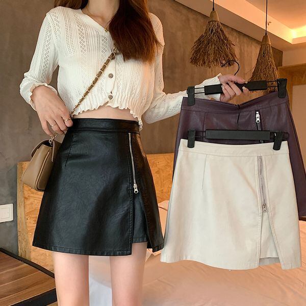 ハイウエスト フェイクレザー Aライン ファスナー ミニスカート