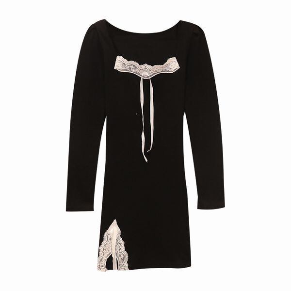 モノトーンで一見シンプルなモノトーンワンピース☆胸元とスリットのリボン&レースがセクシーな印象に◎
