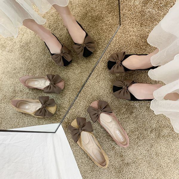 フラットシューズ リボン スエード ローヒール ぺたんこシューズ スクエアトゥ パンプス