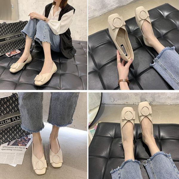 スクエアトゥ ローヒール パンプス 柔軟素材 フラットシューズ
