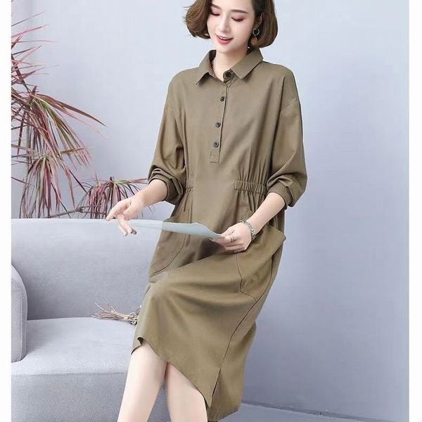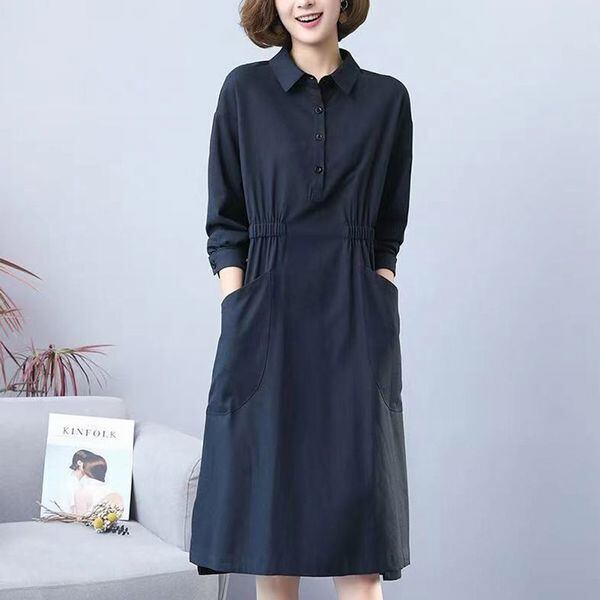 襟付きミドル丈 ひざ丈 長袖 カジュアル リネン プレーン ワンピース