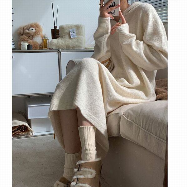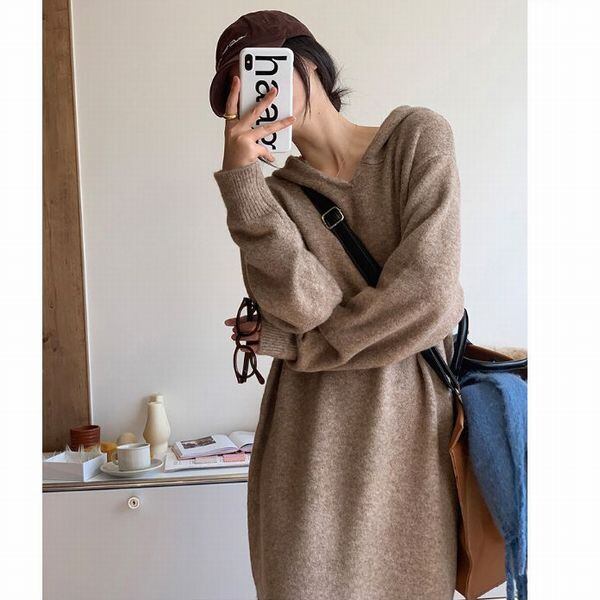 フード付き ロングニット 長袖 Aライン ワンピース マキシワンピ