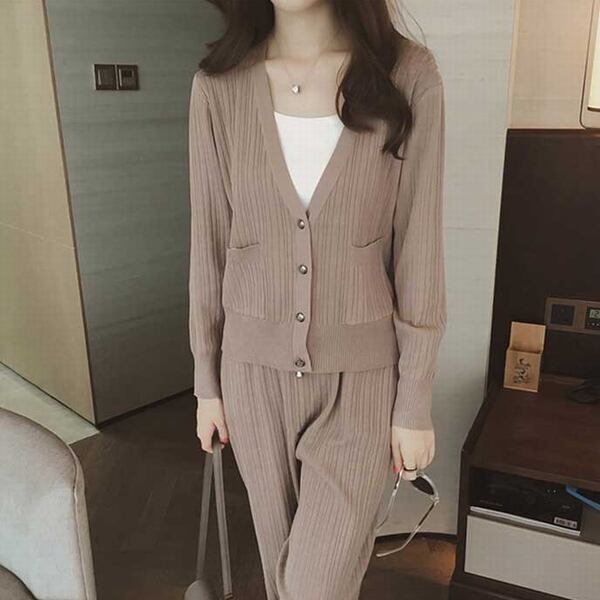 カーディガン リブパンツ 上下 カジュアル セットアップ